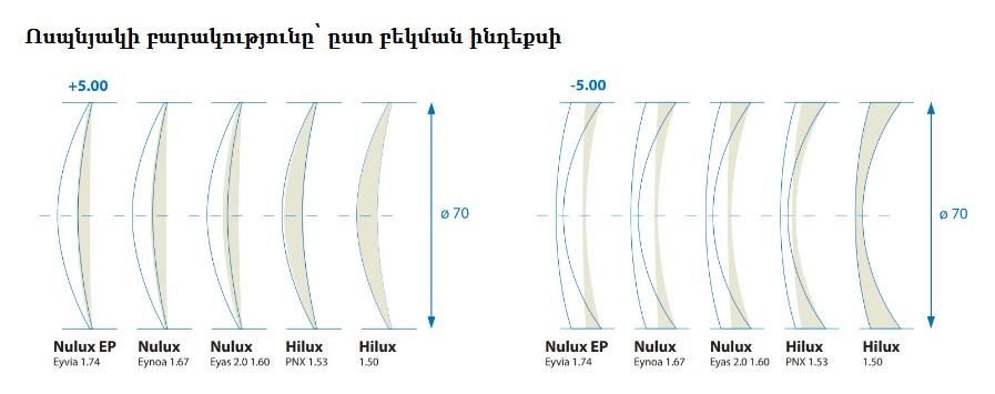 Eyvia 1.74 բեկման բարձր ինդեքսով ոսպնյակները մոտ 35%-ով ավելի բարակ են, քան ստանդարտ պլաստիկ ոսպնյակները։ Բացի ուլտրաբարակ, գերթեթև և հարվածակայուն լինելուց, ոսպնյակները ունեն նաև էլեգանտ և էսթետիկ տեսք: